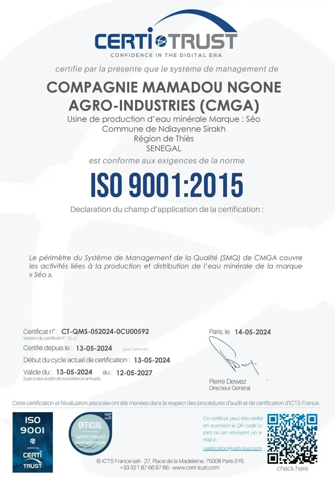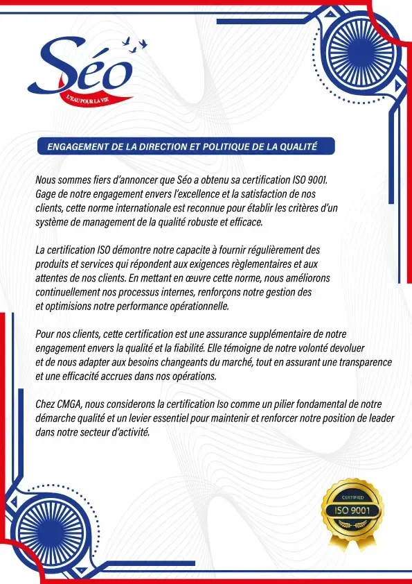 Our ISO 9001:2015 Certification Reflects Séo’s ongoing Commitment to Safety, Reliability and Excellence in every Bottle.